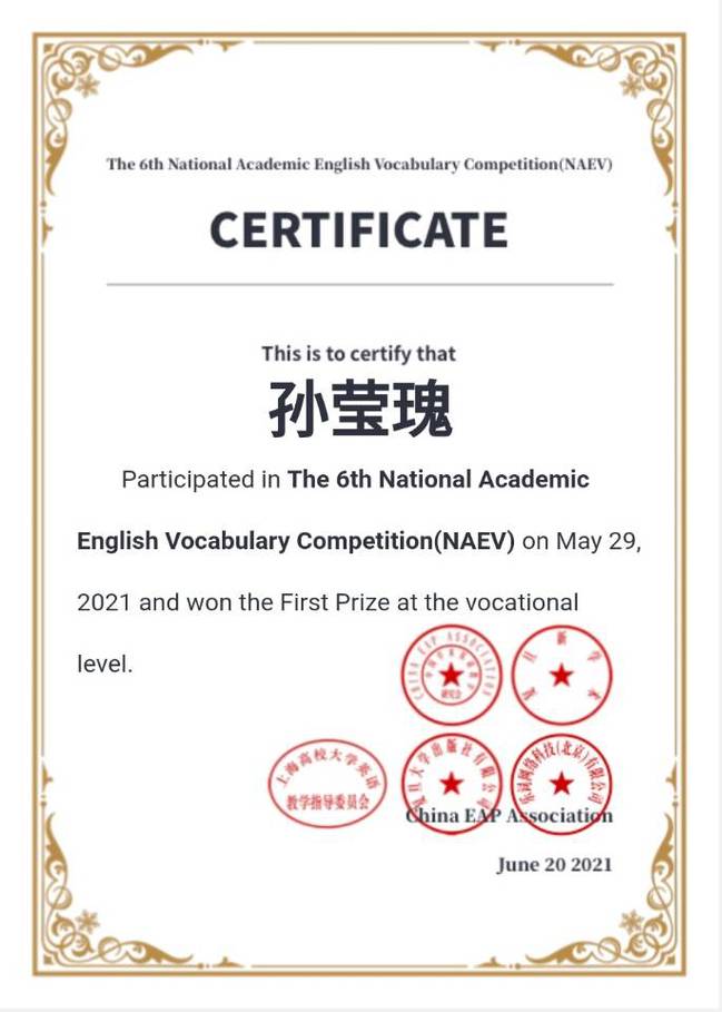 公共英语教研室的老师们在赛前对参赛同学进行了精心辅导。最终,在师生们的共同努力下,我院18级护理国际班的孙莹瑰同学获得了全国一等奖的优异成绩;19级护理国际班方李君、20级学前教育1班陈慧获二等奖;20级护理国际班谢榕霞、20级建工智能化班程麒玮,20级建工管理班孙迎春获三等奖;18会计1班杜莺莺、19建筑创新班张书铭、20工商管理1班江厚庆和王皓宇、20酒店管理1班林馨怡获优胜奖。