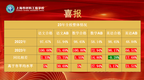 1月11日,2023年上海市中职生公共基础课学业水平考试成绩公布,上海市材料工程学校2022级共218名同学参加考试,成绩喜人,突破了学校历史最好成绩!