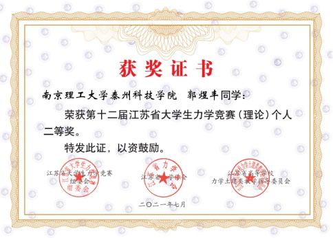 近日,江苏省大学生力学竞赛组委会发来荣誉证书,我校城市建设与设计学院18土木(2)班郭煜丰同学喜获第十二届江苏省大学生力学竞赛本科组个人赛(理论赛)二等奖。这是继获得第三届江苏省力学创新创意竞赛特等奖之后,郭煜丰再次为学校争得了荣誉。