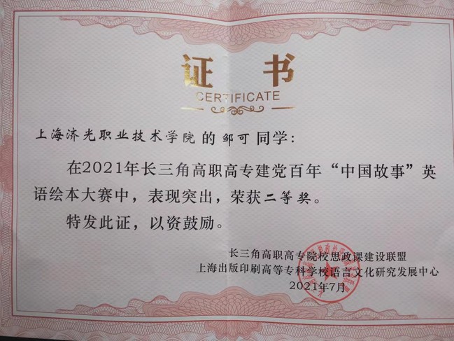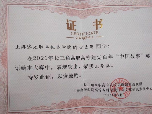 由长三角高职高专院校思政课建设联盟主办,上海出版印刷高等专科学校语言文化研究发展中心承办的建党百年“中国故事”英语绘本大赛于7月底圆满结束。此次比赛有江浙沪12所院校参赛,共40余件有效作品参加角逐。大赛组委会邀请了来自思政、语言和艺术三个领域的全国知名专家进行匿名评审,经过选拔,我院共有5名同学的作品进入决赛。