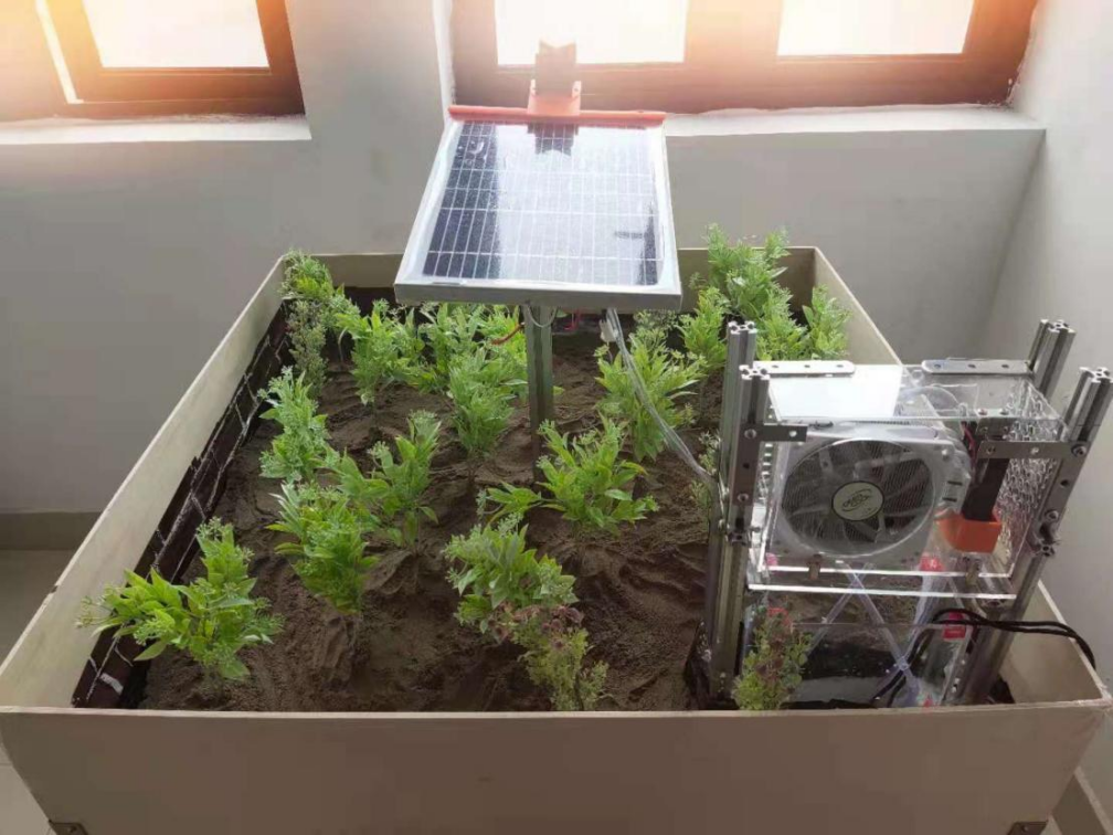 据介绍,一等奖作品光伏治沙智能种植装置,针对沙漠环境下光伏电站中太阳能板温度过高发电效率低、人工清洗光伏面板成本高、缺乏水资源及弃光量大的问题,设计了由空气捕水冷凝装置、滚刷喷淋清洗装置、自动云台追光装置、生态绿化降温装置这四部分组成四维一体化沙漠能源生态圈利用装置。