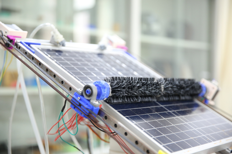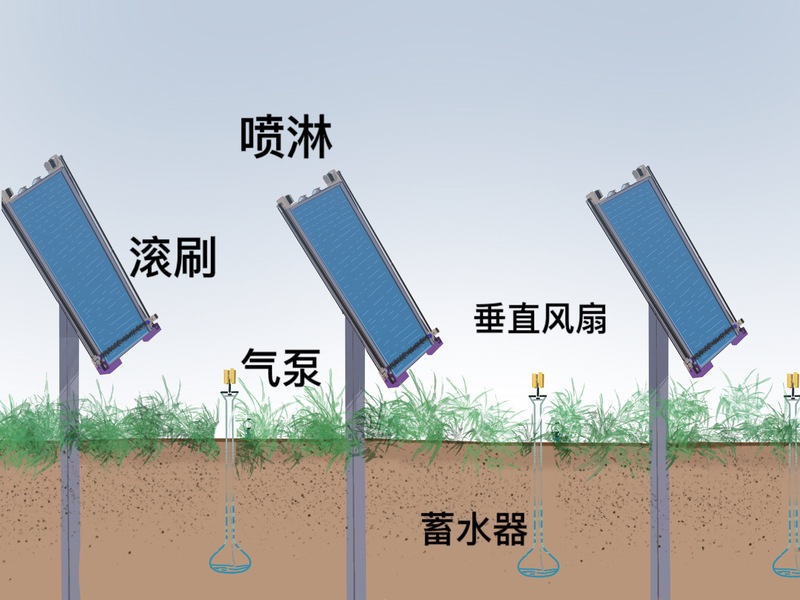 该装置充分利用了光伏发电、种植、凝水、冲洗的四者共生关系。沙漠高温状态下,光伏电板温度过高会导致发电效率低的问题;时间长了,光伏电板表面积蓄沙尘会影响使用,此时,滚刷清洗装置开启,用于降温和表面清洁。滚刷的动力电源来自于光伏电板的弃光用量,清洁水源则利用沙漠昼夜温差形成的自然冷凝水。清洗余水自然滴落浇灌太阳能光伏板下的植被,同时,太阳能光伏板很大程度上可以减少土地蒸发和防风,有利于太阳能光伏板下植被生长存活;光伏板下的植被生长的同时,能有效减少阳光反射率、降低光伏板温度,提高光伏板的工作效率。配合清洗装置,团队制作了空气冷凝器集水装置,将空气中的水冷凝储存到集水箱,解决沙漠清洗用水难问题;并且设计锂电池储能装置收集弃光能量用于凝水装置功耗,以提高资源回收利用效果,使资源利用最大化、节能减排。