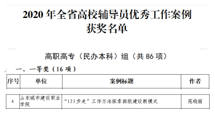 近日,由山东省委教育工委组织开展的全省高校辅导员2020年度优秀工作案例评选结果揭晓,我校喜获两个奖项。其中,苑晓丽老师撰写的《“123步走”工作方法探索班级建设新模式》获得一等奖,杜柯萱老师撰写的《疫情背景下“三位一体”的班级心理辅导》获得三等奖,这是我校继全省高校辅导员2019年度优秀工作案例评选活动获奖以来的又一次突破。