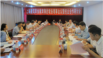 上海建筑职业教育集团常务理事会议暨校企合作研讨会于2017年9月29日下午在上海城建职业学院军工路校区举行,集团各常务理事单位主要负责人参加会议,上海建筑职教集团常务副理事长杨培春主持会议,上海市教委高教处副处长赵坚和上海城建职业学院院长叶银忠等领导出席会议并讲话。