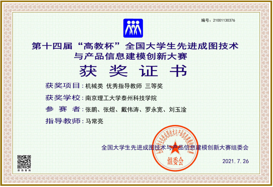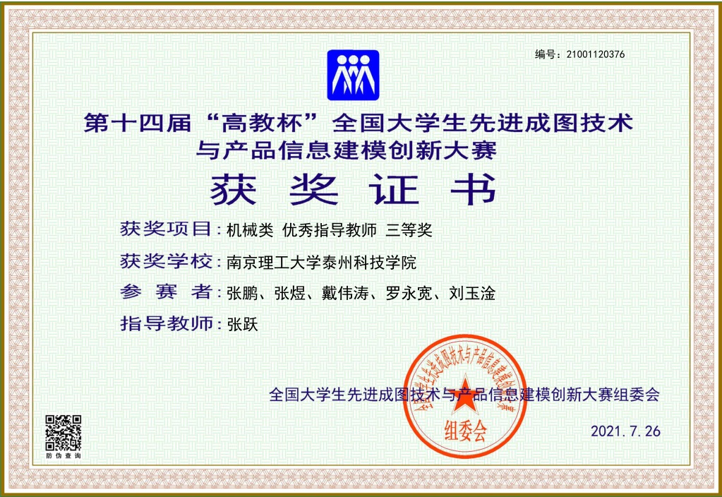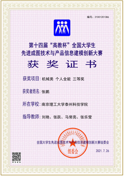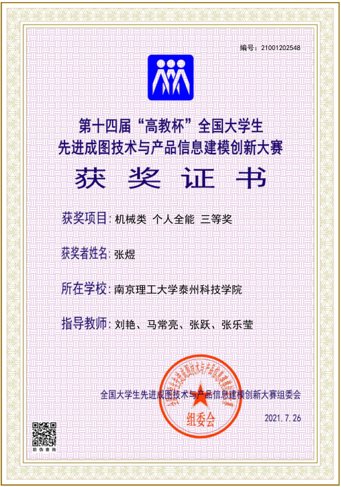 该赛事是由教育部高等学校工程图学课程教学指导委员会、中国图学学会制图技术专业委员会和中国图学学会产品信息建模专业委员会联合主办的图学类课程最高级别的国家级赛事,被誉为“图学界奥林匹克”。该赛事是全国普通高校A类赛事,纳入教育部高等教育学会“全国普通高校学科竞赛排行榜”内赛事。整个赛事包含国家级决赛、省级预选赛、校级预选赛等三个级别。我校智能制造学院从3月份校内选拔,选派2支队伍参加比赛,在张跃、刘艳、马常亮、张乐莹4位老师的精心指导下,在参赛学子们艰苦训练下,5月份在南京参加省级预选赛,1队戴伟涛、张鹏、张煜、申俊伟、罗永宽获得团体二等奖的好成绩,获得参加国赛的资格。今年7月份受疫情影响,本届国赛采取线上形式举行,经过激烈角逐,张鹏、张煜、戴伟涛、罗永宽和刘玉淦荣获国赛团体三等奖;张鹏和张煜获得“个人全能”三等奖;张跃、刘艳、张乐莹、马常亮获得优秀指导老师称号。