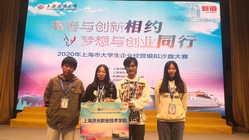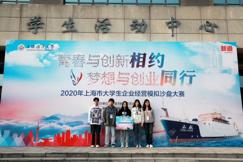 11月8日, 2020年上海市大学生企业经营模拟沙盘大赛在上海海洋大学落下帷幕,经过激烈的角逐,我院经管系2019级会计2班严碧屿、电商4班杜振雨、电商2班朱佳莉、工商班闫汉青组成的参赛队伍荣获高职组二等奖。